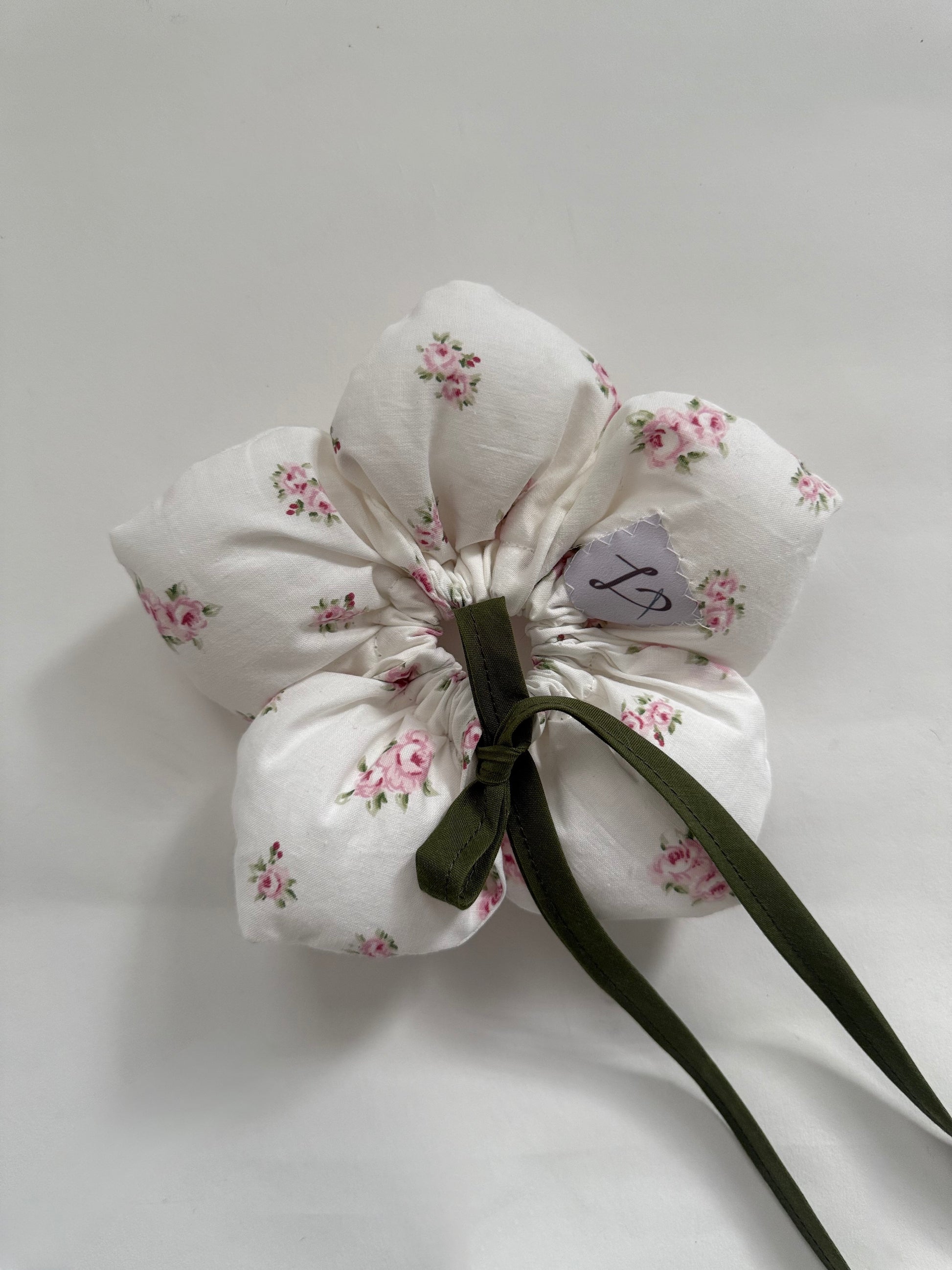 A delicate scrunchie with a story. Handmade in Toronto from thrifted and upcycled fabric, each Sampaguita Scrunchie is one of a kind.